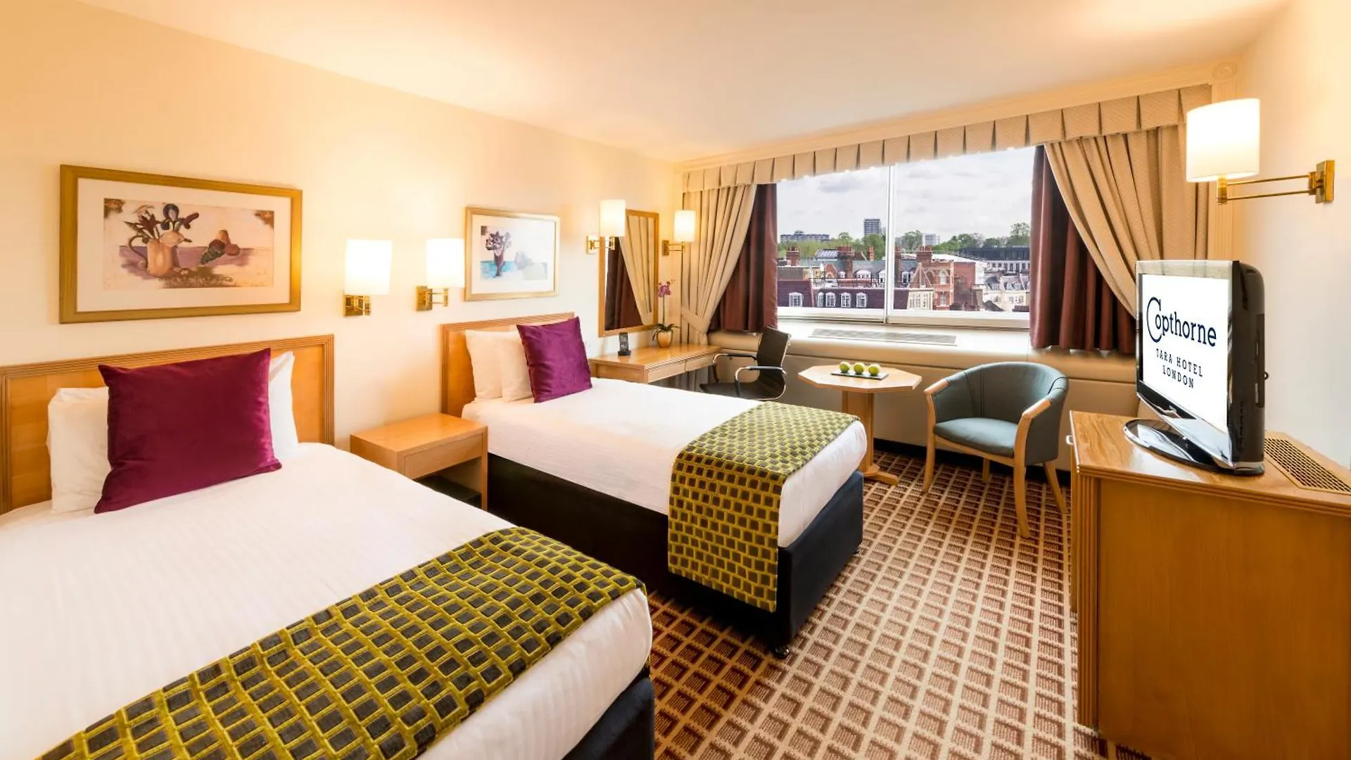 Copthorne Tara Hotel London Kensington offre des chambres avec un coin salon comprenant un fer à repasser et une table à repasser, une climatisation, ainsi qu'une TV à écran plat avec des chaînes satellite. Des chambres non-fumeurs sont approvisionnées d'une douche à l'italienne et un évier. Elles viennent avec des équipements comme un sèche-cheveux et un bonnet de douche. L'hotel offre des chambres modernes avec des vues sur la ville.